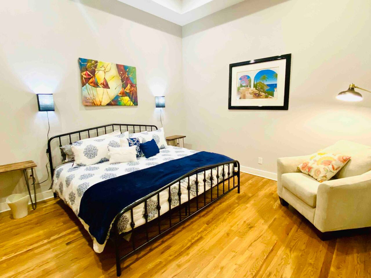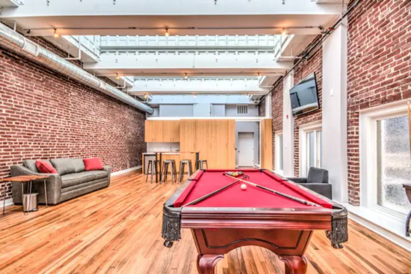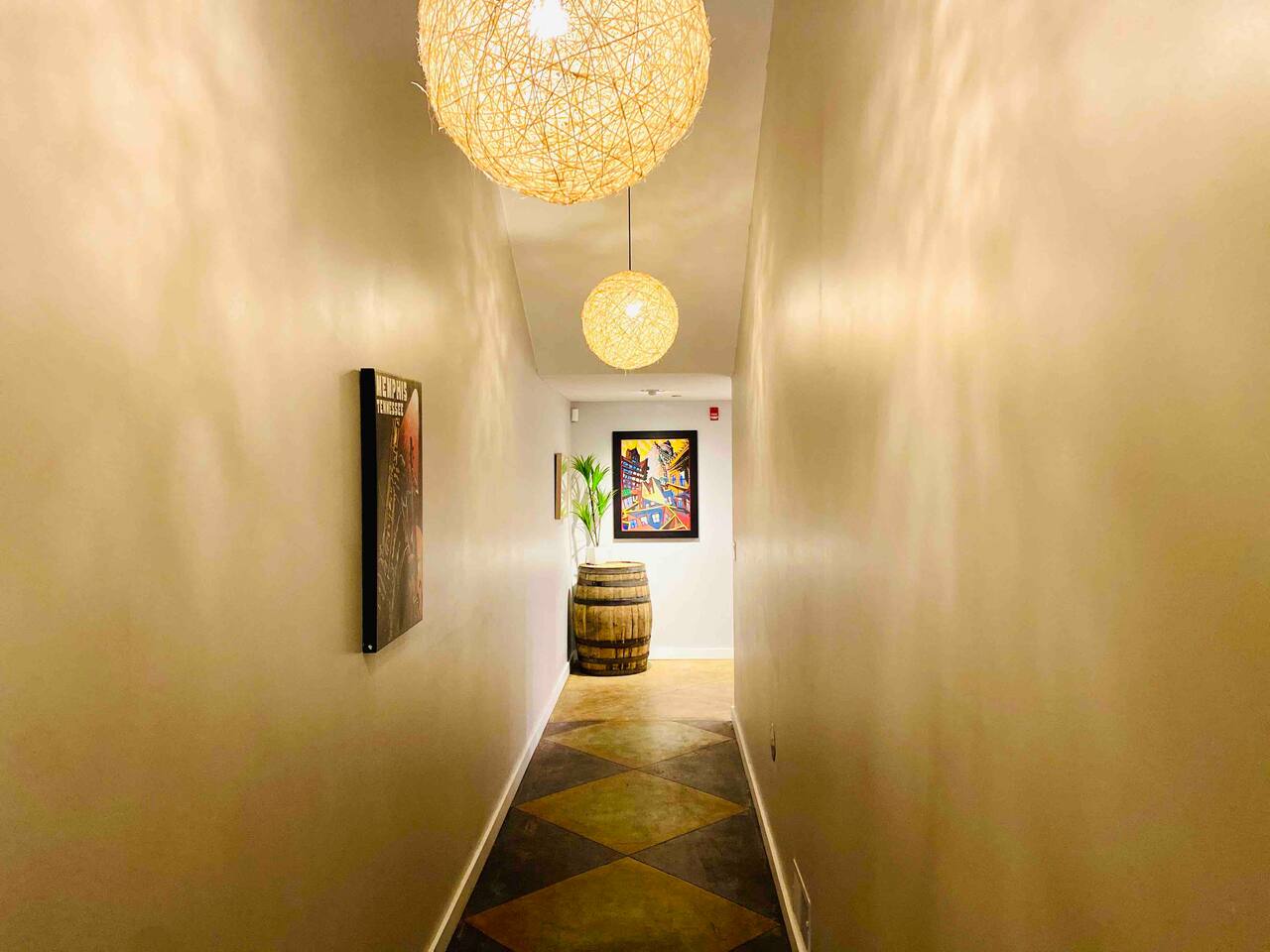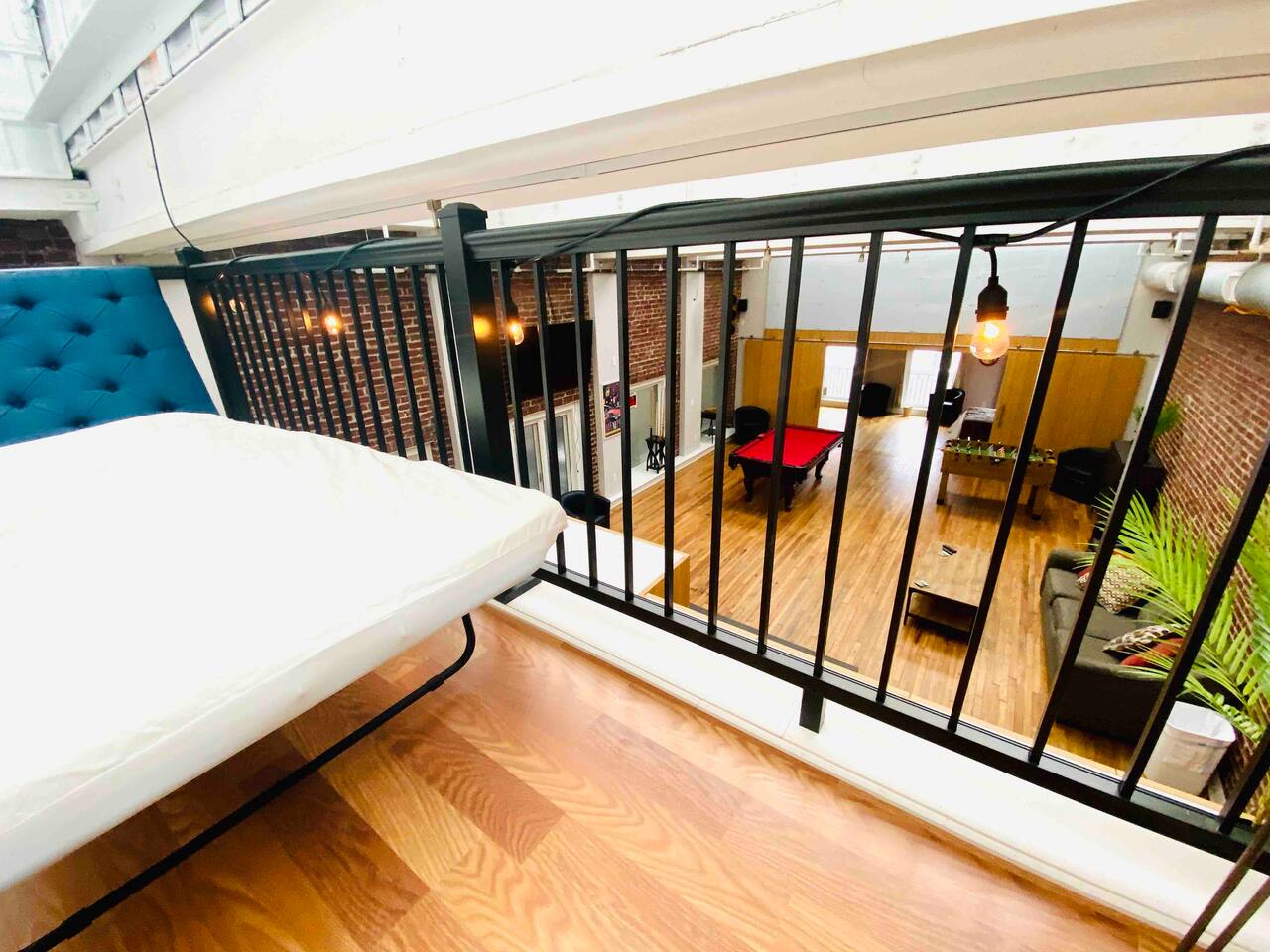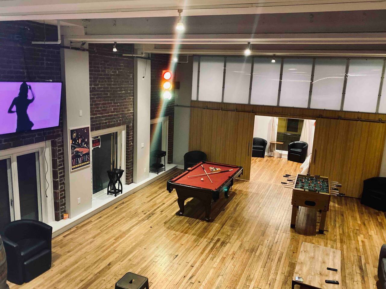 Elevate your next get-together or vacation at this spacious and unique townhome, originally built as a bank in 1925. This stunning property can comfortably accommodate 16 guests or more, and features a variety of exciting and distinctive spaces, including tall ceilings, exposed brick walls, natural light, and multiple levels with a mezzanine. The upper floor, originally designed as a ballroom and later used as a ballet studio, now boasts a large open space game room with gorgeous skylights perfect for entertaining or relaxing. Guests can choose from 5 bedrooms, including a rooftop bed and various extra beds, as well as 2 full bathrooms with tankless water heaters to ensure no one runs out of hot water. The kitchen is fully equipped with modern appliances and cookware, and the living room features a smart TV. Additional amenities include a laundry room, game room with pool table, as well as a motion-activated security camera in entrance lobby for added peace of mind. This unique property has been a popular venue for various events from weddings, to birthdays and several bachelor(ette) parties. It is conveniently located in the heart of downtown Memphis, close to popular attractions and restaurants. Master bedroom (2 guests): located on the second floor. 1 King size bed, reading chair, private closet & smart TV... Bathroom is "en-suite". Guest Bedroom #1 (5 guests): Located on the third floor. 2 Queen size beds with trundle bed & private closet. Guest Bed room #2 (2 guests): Located on the third floor, next to the game room Queen murphy bed & smart TV. Guest bedroom #4 (3 guests): Located on the second floor. Twin over Full bunk bed, bedside light & shelves for storage. Guest bedroom # 5 (1guest): Located in the sunroof deck, above game room. Twin pull-out bed from ottoman exrta beds are available throughout the house: -twin bed under staircase to game room (1 guest) -2 queen convertible sofas (4 guests) -memory foam floor mattresses (4 guests) 2 full bathrooms: Tankless water-heater to ensure large groups don’t run out of hot water. Walk-in showers, lighted mirror, hair dryer, first aid kit in downstairs bathroom. Kitchen: refrigerator, stove, microwave, dishwasher, coffee maker Keurig + regular), pots/pans, cooking utensils etc. Living room: smart TV, Queen sofa sleeper. Game room: Large 1,200 sq.ft area with skylights on top floor, equipped with wet bar, pool and foosball table as well as a dining table and sofa/chairs arranged throughout, smart TV, and many fun games! Laundry room: equiped with large washer/dryer, feturing an iron and ironing board. Security: 1 motion activated security camera located by the front door facing the street. The camera and its data will only be used for the sole purpose of protecting and securing our property. Don't wait any longer!